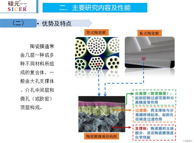樊震坤教授在報告中提及,硅元陶瓷膜產品技術指標達到國際先進水平,形成了1條年產200000平方米高性能陶瓷膜產品的示范線。