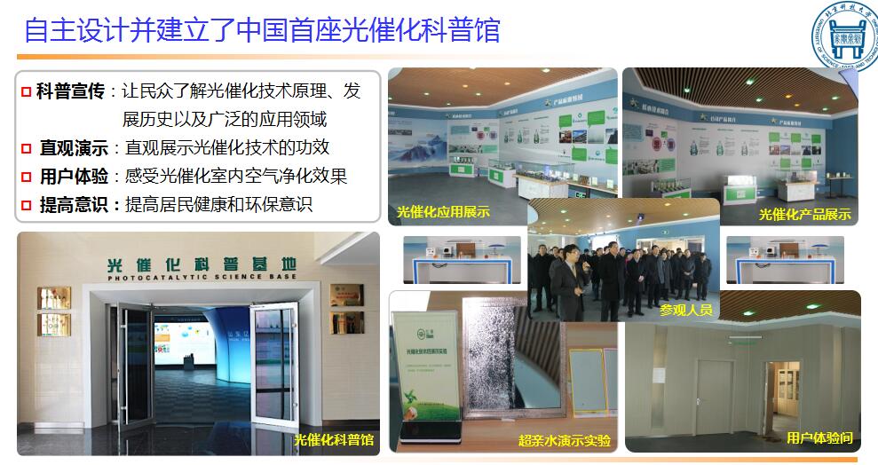 曹文斌教授團隊研發(fā)的光催化噴劑實現了產業(yè)化,與某企業(yè)合作成立了光催化噴劑生產企業(yè),年產能達到500噸,且通過了相關的產品質量認證,并被評為國家級高新技術企業(yè)。另外還自主設計并建立了中國首座光催化科普館。