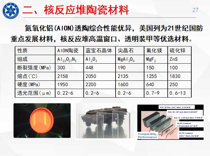 陶瓷材料如SiC陶瓷具有中子特性好、高溫強度大、熱導率大、耐化學腐蝕等優(yōu)良特性,SiC基復合材料若能進一步優(yōu)化性能,具有比金屬材料更好的耐高溫、耐腐蝕等綜合服役性能,將會成為新型核反應堆的首選材料。中國科學院福建物質結構研究所周有福研究員在報告中提出,引入MAX相低溫制備高致密高導熱SiC-TiC復合陶瓷;利用電泳沉積-浸漬熱解法制備高性能SiCf/SiC復合材料;采用固相反應法合成碳化鈹粉體,制備了磁性碳化鈹小球;直接氮化法合成了高質量AlON陶瓷粉體,無壓燒制了直線透過率>80 %高質量AlON陶瓷片等。