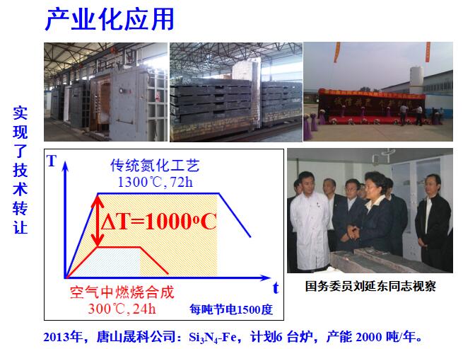 氮化硅陶瓷的市場需求總量巨大,但國內氮化硅粉體與用戶要求的差距很大,制約其規(guī);瘧玫年P鍵因素包括:粉體產品的性能低;產量普遍較低;生產工藝落后。中國科學院理化技術研究所李江濤研究員試圖利用燃燒合成這一典型的低成本制備技術來滿足市場對氮化硅粉體的巨大需求。李研究員團隊在廊坊建立了中試基地并積累了相關的工程化經驗。其團隊在裝備與工藝上的創(chuàng)新使氮化硅陶瓷在合成溫度、制備周期及能耗方面都具備了明顯的優(yōu)勢,為氮化物陶瓷的產業(yè)化鋪平了道路。目前已經成功的產業(yè)化案例包括為某公司建立的年產萬噸燃燒合成VN-Fe生產線,以及為多晶硅鑄錠脫模劑粉體的國內一家龍頭企業(yè)提供的光伏級Si3N4制備技術。