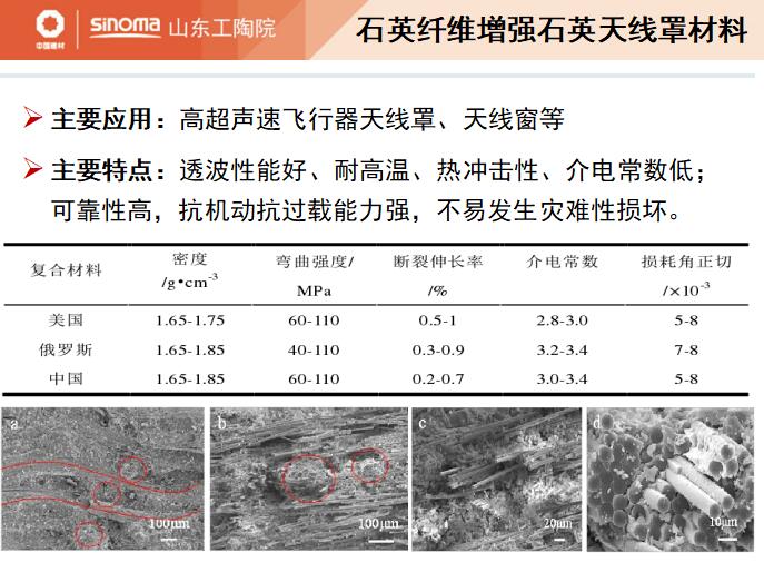 石英材料具有低導熱、低膨脹、低介電常數、低損耗角損耗及良好的高溫性能穩(wěn)定性等優(yōu)點,在防熱、隔熱、透波、承載等領域廣泛應用。山東工業(yè)陶瓷設計研究院新材料事業(yè)部副總經理王洪升在報告中提到,熔融石英陶瓷是應用于超音速導彈天線罩的主要材料,“殲十、梟龍”等戰(zhàn)斗機所攜帶的導彈均選用此材料;國內研制的石英纖維織物增強石英基復合材料已經獲得型號應用,主要應用于高超聲速飛行器天線罩、天線窗等;碳纖維增強石英材料為超高聲速武器用導彈提供耐高溫、低導熱以及低膨脹連接環(huán);輕質、高效隔熱的陶瓷剛性隔熱瓦材料是高超聲速飛行器研制過程的關鍵部件。