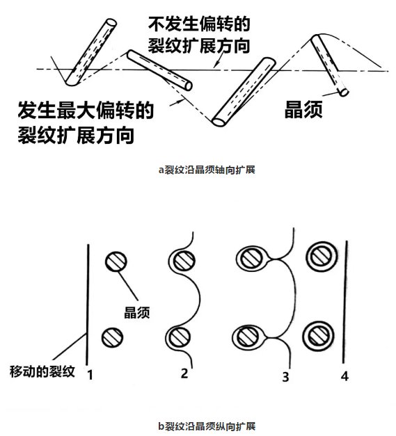 裂紋擴(kuò)展到達(dá)晶須時,被迫沿晶須偏轉(zhuǎn),這意味著裂紋的前行路徑更長,裂紋尖端的應(yīng)力強(qiáng)度減少,裂紋偏轉(zhuǎn)的角度越大,能量釋放效率就越低,增韌效果就越好,斷裂韌性就提高。如圖a、b所示。圖b表示:①裂紋和晶須相遇;②裂紋彎曲向前③在晶須前面相接④形成新的裂紋前沿并留下裂紋。