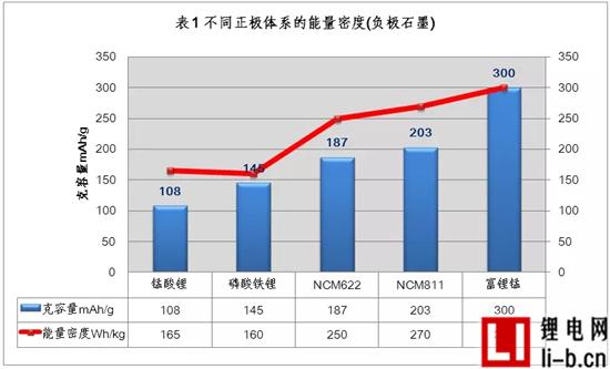 高克容量(200-300mAh/g )和工作電壓高(>4.5V),所以具有亮眼的能量密度。富鋰錳基材料與當(dāng)前動(dòng)力電池主流正極材料的克容量和能量密度對(duì)比(表1)。同時(shí)Mn元素比例的提高同時(shí)減少了Co的含量,降低了材料價(jià)格,且對(duì)環(huán)境友好。