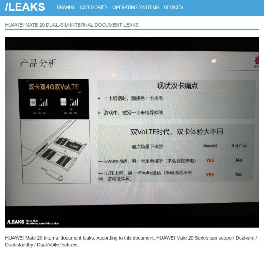 除了石墨烯散熱技術(shù)之外,最近還有知名爆料網(wǎng)站slashleaks爆料了一張華為Mate20系列發(fā)布會(huì)的PPT,說明這款將于10月16日發(fā)布的新機(jī)將采用雙卡雙通技術(shù),這個(gè)技術(shù)可以說是實(shí)力打臉了新iPhone的DSDS。