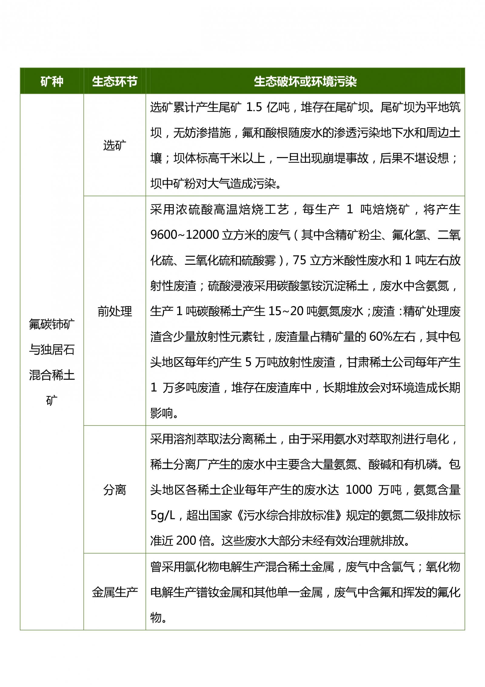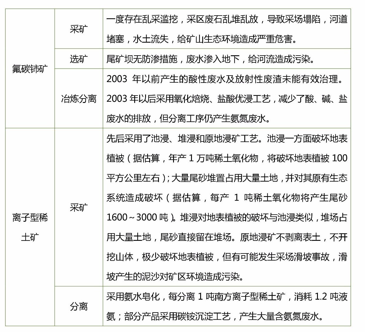 過量開采導致土地、植被破壞、水土流失,影響生態(tài)環(huán)境,遇到雨水沖刷,覆蓋下游河床與田地,嚴重污染水源;稀土煉及加工過程中排放大量的“三廢”。