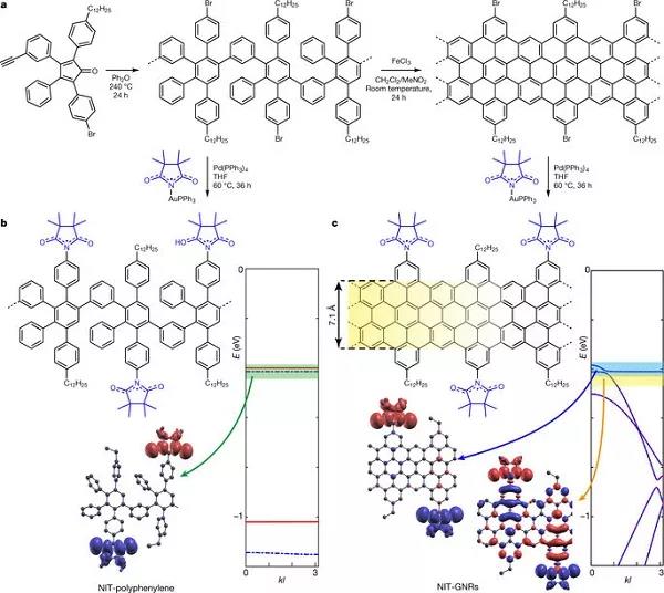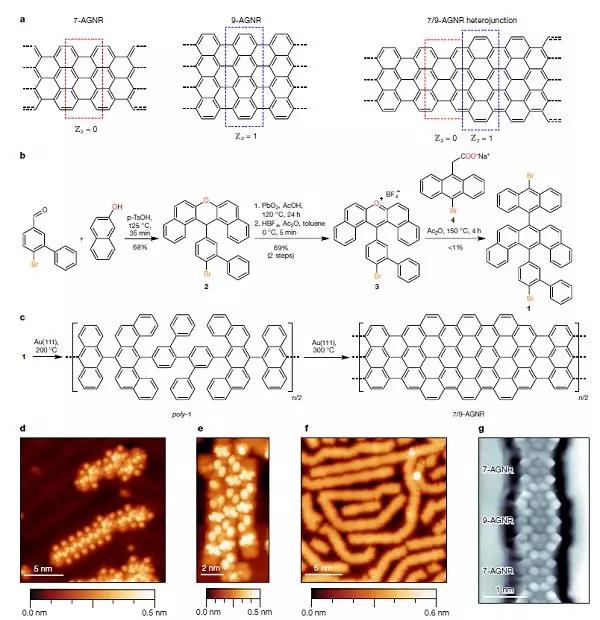 美國(guó)加州大學(xué)伯克利分校的Steven G. Louie教授、Michael F. Crommie教授和Felix R. Fischer教授(共通通訊作者)在國(guó)際著名期刊Nature發(fā)表了一篇題為“Topological band engineering of grapheme nanoribbons”的研究性文章。在該文中,研究人員報(bào)道了拓?fù)涔こ绦揎桮NR超晶格的合理設(shè)計(jì)和實(shí)驗(yàn)實(shí)現(xiàn),從而產(chǎn)生了難以獲得的電子結(jié)構(gòu);此外,該策略還能將新的終態(tài)直接設(shè)計(jì)到一維GNR超晶格的末端。原子級(jí)精確的拓?fù)銰NR超晶格由Au(111)表面上的分子前體在超高真空條件下合成,并通過(guò)低溫掃描隧道顯微鏡(STM)和光譜學(xué)得以表征。實(shí)驗(yàn)結(jié)果和第一性原理計(jì)算表明,該GNR超晶格的邊界能帶結(jié)構(gòu)(滿帶和空帶)完全由相鄰?fù)負(fù)浣缑鎽B(tài)之間的耦合所定義,這種非凡的一維拓?fù)湎酁榛陔娮油負(fù)鋵W(xué)一維材料的能帶精確調(diào)控提供了一種途徑,同時(shí)其也是一種有前景的一維量子自旋物理學(xué)研究平臺(tái)。