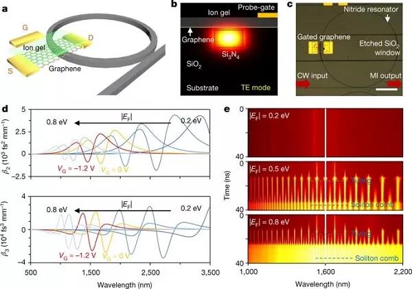 來(lái)自成都電子科技大學(xué)的姚佰承(通訊作者)的團(tuán)隊(duì)在Nature發(fā)表了題為Gate-tunable frequency combs in graphene–nitride microresonators的文章,通過(guò)將柵極可調(diào)光導(dǎo)與氮化硅光子微諧振器耦合,從而通過(guò)改變費(fèi)米能級(jí)來(lái)調(diào)制其二階和更高階色散來(lái)證明石墨烯基光學(xué)頻率梳的門(mén)控腔內(nèi)可調(diào)諧性。他們實(shí)現(xiàn)了雙層離子凝膠門(mén)控晶體管,以在單電壓電平控制下調(diào)節(jié)石墨烯0.45-0.65電子伏特范圍內(nèi)的費(fèi)米能級(jí)。他們進(jìn)一步證明了從周期性孤子晶體到具有缺陷的晶體的電壓可調(diào)諧轉(zhuǎn)換,這種結(jié)合了單原子層納米科學(xué)和超快光電子的異質(zhì)石墨烯微腔將有助于提高我們對(duì)動(dòng)態(tài)頻率梳和超快光學(xué)的理解。
