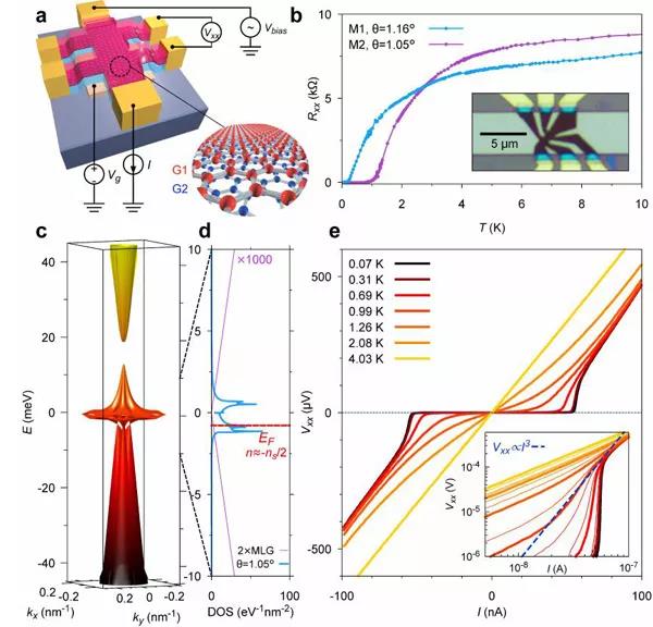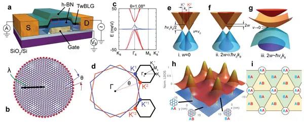美國(guó)麻省理工學(xué)院P. Jarillo-Herrero教授(通訊作者)和曹原(第一作者)團(tuán)隊(duì)的帶領(lǐng)下,與美國(guó)哈佛大學(xué),日本國(guó)立材料科學(xué)研究所合作,報(bào)道了堆疊具有小扭曲角的兩個(gè)石墨烯片中二維超晶格,產(chǎn)生一種全新的電子態(tài)——超導(dǎo)態(tài)。當(dāng)旋轉(zhuǎn)角度小到魔角時(shí)(<1.05°),扭曲的雙層石墨烯中垂直堆疊的原子區(qū)域會(huì)形成窄電子能帶,電子相互作用效應(yīng)增項(xiàng),從而產(chǎn)生非導(dǎo)電的Mott絕緣態(tài)。在Mott絕緣態(tài)情況下加入少量電荷載流子,就可以成功轉(zhuǎn)變?yōu)槌瑢?dǎo)態(tài)。相關(guān)成果以題為“Unconventional superconductivity in magic-angle graphene superlattices”發(fā)表在了Nature上。