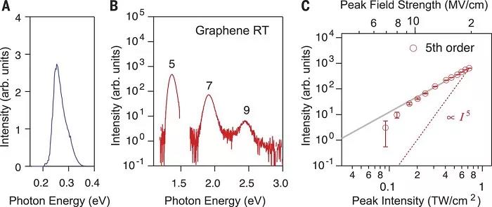 京都大學(xué)的Naotaka Yoshikawa教授(通訊作者)和Koichiro Tanaka教授(通訊作者)等人研究發(fā)現(xiàn),在室溫,中紅外脈沖激光的激發(fā)下石墨烯中最多可以觀察到九次諧波,通過(guò)橢圓偏振激光器激發(fā)可以增強(qiáng)石墨烯中的HHG,產(chǎn)生的諧波輻射也會(huì)發(fā)生極化。實(shí)驗(yàn)中觀察到橢圓率的依賴關(guān)系可以通過(guò)固體中的量子力學(xué)來(lái)處理以及理論計(jì)算仿真。石墨烯零帶隙也使得石墨烯中的HHG有著獨(dú)特的特點(diǎn)。實(shí)驗(yàn)結(jié)果為進(jìn)一步研究強(qiáng)場(chǎng),超快動(dòng)力學(xué)以及狄拉克費(fèi)米子的非線性行為奠定了基礎(chǔ)。