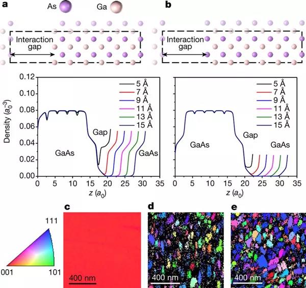 麻省理工學(xué)院 (MIT) 的Jeehwan Kim (通訊作者) 等人在Nature 雜志上發(fā)表了一篇題為“Remote epitaxy through graphene enables two-dimensional material-based layer transfer”的文章。該文章報(bào)道了在石墨烯夾層存在下,仍可實(shí)現(xiàn)在GaAs基底上同質(zhì)外延生長(zhǎng)GaAs層的工作。通過(guò)密度泛函理論計(jì)算發(fā)現(xiàn)在一定距離內(nèi),兩GaAs晶面間隙中仍存在電子分布。且實(shí)驗(yàn)結(jié)果表明,石墨烯較弱的范德華勢(shì)不能完全屏蔽基底和外延層間的相互作用,從而實(shí)現(xiàn)了在單層石墨烯夾層存在下遠(yuǎn)距離同質(zhì)外延生長(zhǎng)GaAs,InP和GaP。該方法生長(zhǎng)的GaAs等材料為高質(zhì)量單晶,且石墨烯夾層的存在使外延層可以快速完整的從基底剝離。用該方法制備的AlGaInP-GaInP 雙異質(zhì)結(jié)LEDs的性能也可與直接在GaAs基底上外延生長(zhǎng)制備的LEDs相匹敵。