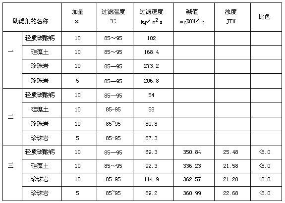 根據(jù)生產(chǎn)中過濾工藝條件進(jìn)行試驗(yàn),將半成品加熱升溫到900C~1000C加入定量的助濾劑過濾,然后對比過濾同等量濾液的時(shí)間,以下是各種助濾劑的過濾速度。具體試驗(yàn)結(jié)果見表。