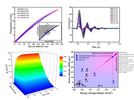 小型化和輕量化一直是儲(chǔ)能電容器的重要發(fā)展趨勢(shì)。為此,該團(tuán)隊(duì)聚焦尚無(wú)文獻(xiàn)報(bào)道的鈮酸鈉(NaNbO3)體系。NaNbO3的體積密度僅為4.55g/cm3,相比鐵酸鉍(8.37g/cm3)、鈦酸鋇(6.02g/cm3)、鈦酸鉍鈉 (5.977g/cm3)等其它無(wú)鉛介質(zhì)材料體系,它在儲(chǔ)能電容器的輕量化方面具有明顯的優(yōu)勢(shì)。然而,電場(chǎng)誘導(dǎo)的亞穩(wěn)態(tài)鐵電性和堿金屬鈉元素?fù)]發(fā)導(dǎo)致的耐電強(qiáng)度低制約了NaNbO3在儲(chǔ)能方面的應(yīng)用。該團(tuán)隊(duì)先后采用順電體調(diào)控和A位空位策略來(lái)增強(qiáng)NaNbO3的儲(chǔ)能特性,構(gòu)筑了兩種新型的NaNbO3基儲(chǔ)能介質(zhì)陶瓷材料:NaNbO3-SrTiO3和Na1-3xBixNbO3。這兩種NaNbO3基儲(chǔ)能介質(zhì)陶瓷材料均表現(xiàn)出了優(yōu)異的儲(chǔ)能特性、充放電特性及穩(wěn)定性,其中Na1-3xBixNbO3的綜合儲(chǔ)能特性(儲(chǔ)能密度:4.03J/cm3、儲(chǔ)能效率:85.4%、功率密度:62.5 MW/cm3)為目前文獻(xiàn)報(bào)道的最優(yōu)值。該工作為NaNbO3材料開(kāi)辟了新的應(yīng)用方向,同時(shí)也為設(shè)計(jì)高儲(chǔ)能無(wú)鉛介質(zhì)材料提供了新的方法和思路。相關(guān)研究成果發(fā)表在Journal of Materials Chemistry A (J. Mater. Chem. A, 2018,6, 17896-17904)和ACS Sustainable Chemistry & Engineering (ACS Sustainable Chem. Eng. 2018, 6, 10, 12755-12765)上。