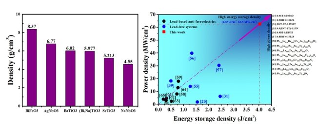 幾種典型無(wú)鉛介質(zhì)材料體系的體積密度對(duì)比圖(左)和Na1-3xBixNbO3綜合儲(chǔ)能特性與文獻(xiàn)對(duì)比圖(右)