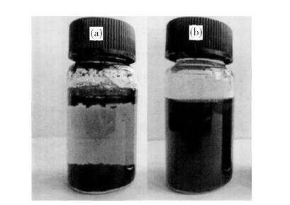 石墨烯(a)和硅烷化處理的石墨烯(b)在水中的分散性照片