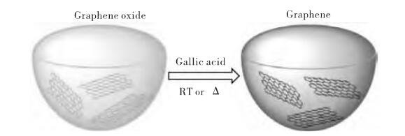 Jing采用具有強(qiáng)還原能力的沒食子酸作為穩(wěn)定劑和還原劑,制得了具有高分散性的石墨烯。由于分子中苯環(huán)結(jié)構(gòu)和石墨烯之間形成了π—π共軛相互作用,從而作為穩(wěn)定劑吸附在石墨烯表面,這使得石墨烯片層具有較強(qiáng)的負(fù)電性,阻止了石墨烯片進(jìn)一步堆積在一起,使其更加難于團(tuán)聚,保證了所制備的石墨烯具有較高的分散性能。