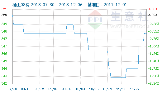 中國(guó)粉體網(wǎng)訊 12月5日稀土指數(shù)為348點(diǎn),較昨日上升了1點(diǎn),較周期內(nèi)最高點(diǎn)1000點(diǎn)(2011-12-06)下降了65.20%,較2015年09月13日最低點(diǎn)271點(diǎn)上漲了28.41%。(注:周期指2011-12-01至今)。