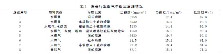 陶瓷行業(yè)廢氣中煙塵來源主要是生產(chǎn)制造過程中產(chǎn)生的顆粒物以及水煤氣、水煤漿燃燒產(chǎn)生的煙塵。表1選取了此次監(jiān)測(cè)中較為典型的8家陶瓷企業(yè)進(jìn)行對(duì)比分析,從治理前后的數(shù)據(jù)可知,用水煤漿、水煤氣為燃料的企業(yè),治理前煙塵含量明顯高于天然氣為燃料的企業(yè),各家企業(yè)通過投用除塵技術(shù)后,均能有很好的除塵效率,處理后煙塵濃度明顯降低。