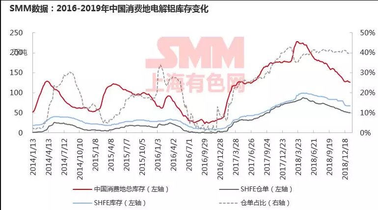 2018年受供給側(cè)改革和供暖季政策影響,電解鋁產(chǎn)量增速下滑,整體消費(fèi)增速超過(guò)供應(yīng)增速?gòu)亩俪扇?kù)存的情況。據(jù)SMM數(shù)據(jù)顯示,2016年中國(guó)電解鋁產(chǎn)量增速為3.9%,2017年中國(guó)電解鋁產(chǎn)量增速為14.2%。2018年由于減產(chǎn)規(guī)模擴(kuò)大以及新增產(chǎn)能投放速度低于年初預(yù)期,鋁價(jià)國(guó)內(nèi)電解鋁產(chǎn)量增速為-0.4%,由下圖可見(jiàn)電解鋁與鋁錠庫(kù)存依然偏高,因而除非在超預(yù)期的鋁錠消費(fèi)態(tài)勢(shì)下,大幅度去庫(kù)存才能實(shí)現(xiàn),否則2019年鋁錠高庫(kù)存將成為新常態(tài)。