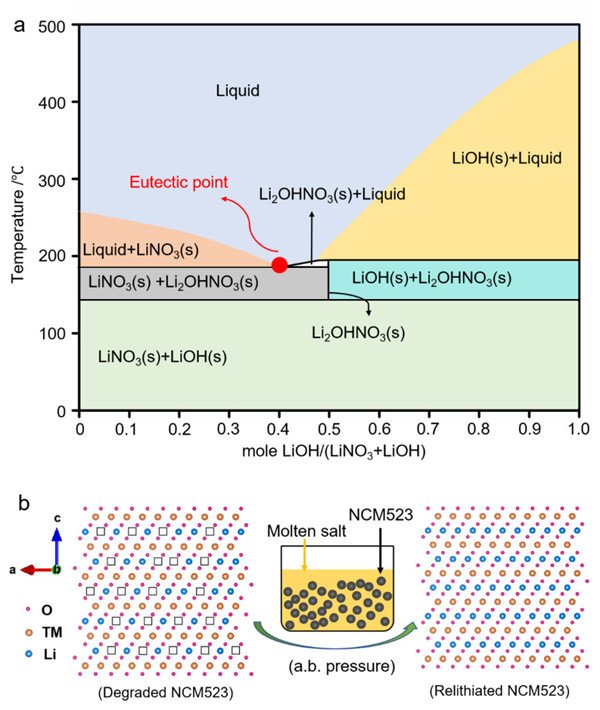 圖1 (a) LiNO3-LiOH相圖 (b) 鋰熔融鹽為衰減的NCM523材料補鋰示意圖