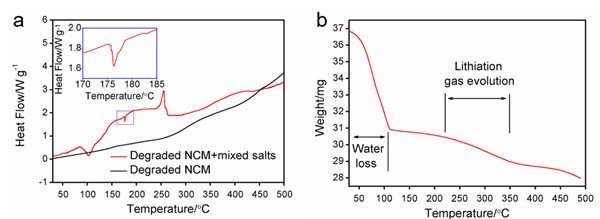 圖2 NCM523和鋰鹽混合物的 (a) DSC曲線, (b) TGA 曲線