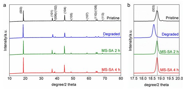 ICP對化學(xué)組分的測量結(jié)果顯示,衰減后的NCM523有高達(dá)40%的鋰流失,鋰的含量只有原始含量的60%,另外,在X射線衍射圖中(圖3),衰減后的材料(003)峰明顯左移,對應(yīng)于層間距的增大,與鋰的流失有直接關(guān)系。而經(jīng)過再生后的材料,ICP結(jié)果顯示鋰含量恢復(fù)至原始值,而且(003)峰移回至原始位置,證明了該再生過程成功將鋰補充進(jìn)衰減的正極材料。