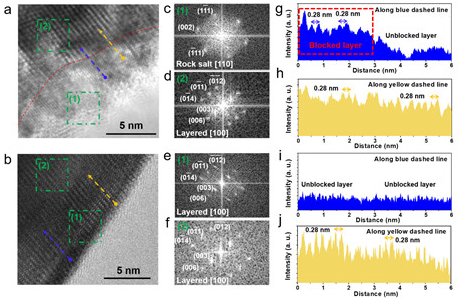 圖4 衰減后 (a, c, d,g, h) 和再生后 (b, e, f, i, j) 的NCM523正極材料的高分辨TEM/FFT圖像及強(qiáng)度曲線