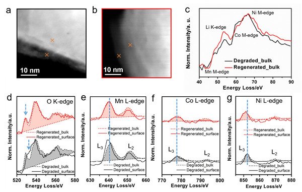 在衰減的材料表面高分辨TEM圖像中觀察到了鹽巖相結(jié)構(gòu)(圖4),沿鋰層的強(qiáng)度曲線顯示表面的強(qiáng)度顯著增加,該現(xiàn)象由過渡金屬元素遷移到鋰所在層導(dǎo)致,證明了材料表面發(fā)生了相變。而在再生的材料表面并未觀察到鹽巖相和過渡金屬元素在鋰層的存在。EELS可獲得衰減/再生材料的表面和內(nèi)部的過渡金屬氧化態(tài)(圖5),進(jìn)一步支持了從TEM圖像中得到的結(jié)論:再生過程可以將鹽巖相恢復(fù)至材料原始的層狀結(jié)構(gòu),實現(xiàn)了表面晶體結(jié)構(gòu)的恢復(fù)。
