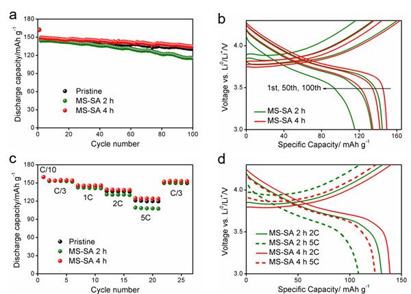 經(jīng)過4 小時的熔融鹽補鋰反應(yīng),再生材料的容量,循環(huán)性能和倍率性能都完全恢復(fù)至原始材料具有的性能(圖6)。而2 小時的補鋰反應(yīng)時間較短,反應(yīng)并未完全,所以各個指標(biāo)都低于原始材料。