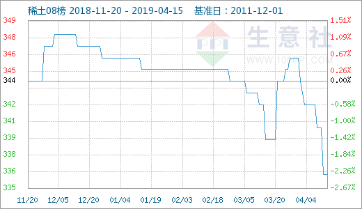 中國粉體網(wǎng)訊 4月14日稀土指數(shù)為336點,與昨日持平,較周期內(nèi)最高點1000點(2011-12-06)下降了66.40%,較2015年09月13日最低點271點上漲了23.99%。(注:周期指2011-12-01至今)。