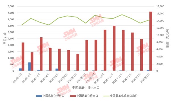 中國粉體網訊 2019年第一季度,中國碳酸鋰進口量為3,316噸,同比下降57%,環(huán)比下降19%。出口量為4,809噸,同比增長432%,環(huán)比上漲11%。其中,3月份碳酸鋰出口量為2,897噸,環(huán)比增長132%。另一方面,2019年第一季度,中國氫氧化鋰進口量為78噸,同比下降92%,環(huán)比下降13%。出口量為10016噸,同比上漲61%,環(huán)比增長2%。其中,3月份氫氧化鋰出口量為4,582噸,環(huán)比增長86%。