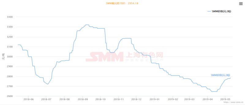 因多方面因素影響,國內(nèi)氧化鋁價(jià)格自2018年9月開始一路下滑,今年4月15日觸及2017年8月21日以來的低點(diǎn)2645元/噸,隨后價(jià)格有所反彈,5月13日SMM氧化鋁均價(jià)報(bào)2803元/噸。