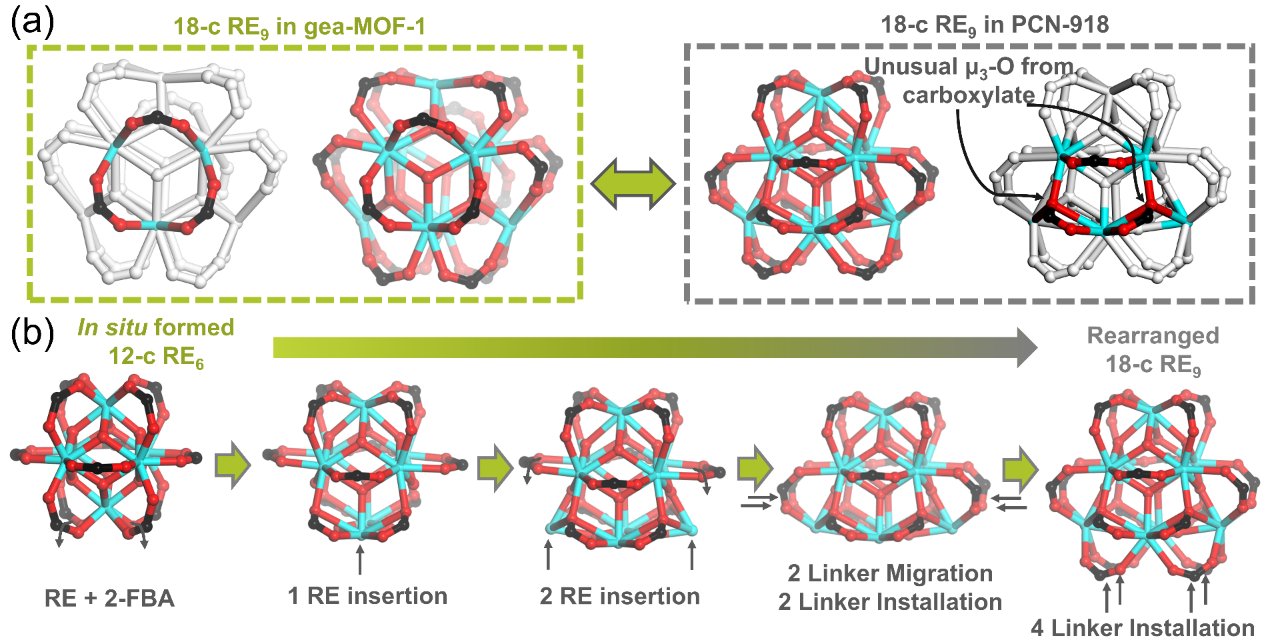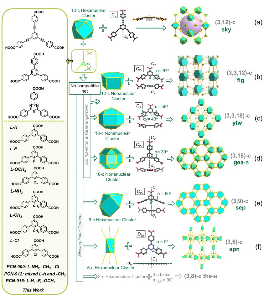 針對這一問題,孫道峰團隊從多功能的稀土金屬出發(fā),利用官能團的位阻效應(yīng),從分子層面精確地設(shè)計并控制MOF結(jié)構(gòu),得到了三種新型的拓?fù)浣Y(jié)構(gòu),并詳細(xì)介紹了MOF材料的設(shè)計及控制策略,對多核稀土團簇的轉(zhuǎn)變過程進行了解釋,最后通過密度泛函理論(DFT)對提出的位阻控制策略進行了驗證,從理論計算方面對觀點進行佐證,并利用研究者名字簡寫對其進行命名(ytw),將其存于國際拓?fù)浣Y(jié)構(gòu)數(shù)據(jù)庫中(Reticular Chemistry Structure Resource)。該項工作表明,高度復(fù)雜的網(wǎng)絡(luò)可以通過系統(tǒng)和連續(xù)的空間調(diào)控來合理設(shè)計和構(gòu)建,這將為功能化多孔框架材料的設(shè)計和構(gòu)建提供有力的理論基礎(chǔ)。