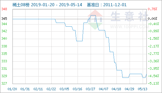 中國(guó)粉體網(wǎng)訊 5月13日稀土指數(shù)為330點(diǎn),較昨日上升了1點(diǎn),較周期內(nèi)最高點(diǎn)1000點(diǎn)(2011-12-06)下降了67.00%,較2015年09月13日最低點(diǎn)271點(diǎn)上漲了21.77%。(注:周期指2011-12-01至今)。