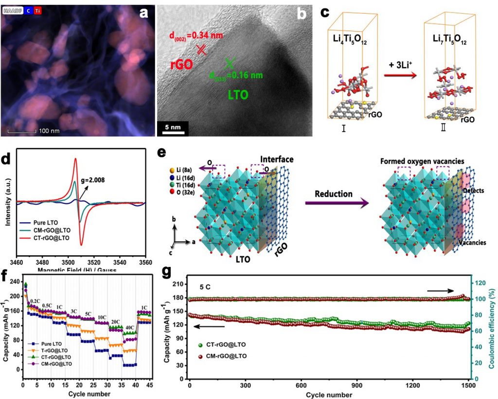 圖1. (a)CT-rGO@LTO復合材料SEM圖;(b)CT-rGO@LTO復合材料的高分辨TEM圖;(c)DFT模擬Li+ 在優(yōu)化的CT-rGO@LTO模型中進行嵌鋰過程;(d)CT-rGO@LTO復合物EPR圖;(e)氧空位形成機理圖;(f)CT-rGO@LTO電極的倍率性能;(g)CT-rGO@LTO電極的循環(huán)性能。(來源網(wǎng)絡)