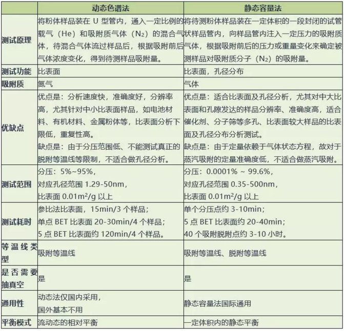氮吸附法根據(jù)吸附過程和吸附質(zhì)確定方式的不同又分為動態(tài)色譜法和靜態(tài)法。動態(tài)色譜法和靜態(tài)容量法是目前常用的主要的比表面測試方法。兩種方法比較而言,動態(tài)色譜法比較適合測試快速比表面積測試和中小吸附量的小比表面積樣品(對于中大吸附量樣品,靜態(tài)法和動態(tài)法都可以定量的很準確),靜態(tài)容量法比較適合孔徑及比表面測試。