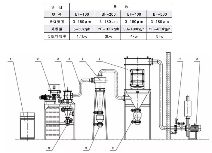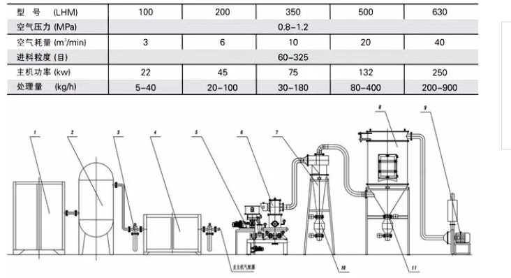 1.螺桿空壓機(jī) 2.儲氣罐 3.空氣過濾器 4.冷凍干燥機(jī) 5.自動加料機(jī) 6.流化床氣流粉碎機(jī)7.旋風(fēng)分離器 8.捕集器 9.高壓風(fēng)機(jī) 10.不銹鋼過濾料倉 11.氣動蝶閥