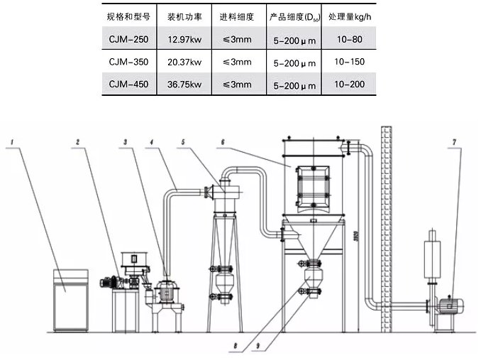 1.控制柜 2.自動加料機(jī) 3.超細(xì)粉碎機(jī) 4.PVC塑料波紋管 5.旋風(fēng)分離器 6.捕集器 7.高壓引風(fēng)機(jī) 8.不銹鋼過渡料倉 9.氣動蝶閥