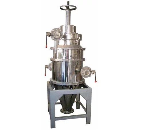 物料通過加料機(jī)均勻加入分級機(jī)后,在分級區(qū)依靠分級輪進(jìn)行分散、分級。滿足粒度要求的細(xì)粉經(jīng)分級輪進(jìn)入捕集系統(tǒng),粗粉甩至筒壁并向下移動至二次進(jìn)風(fēng)處,在此處物料再由進(jìn)入機(jī)體的二次空氣所產(chǎn)生的上升氣流沖刷,使粗、細(xì)粉再次分離,細(xì)粉進(jìn)入分級區(qū)經(jīng)分級輪分級,粗粉則由分級機(jī)下部的出料口排出。