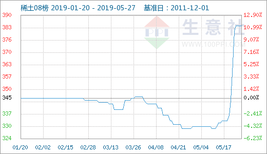 中國(guó)粉體網(wǎng)訊 5月26日稀土指數(shù)為384點(diǎn),與昨日持平,較周期內(nèi)最高點(diǎn)1000點(diǎn)(2011-12-06)下降了61.60%,較2015年09月13日最低點(diǎn)271點(diǎn)上漲了41.70%。(注:周期指2011-12-01至今)。
