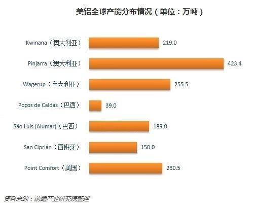 根據(jù)美國(guó)鋁業(yè)2017年年報(bào),其在各氧化鋁工廠擁有的權(quán)益產(chǎn)能約15064千噸,其中位于美國(guó)的產(chǎn)能約2305千噸。