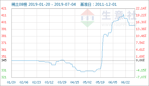 中國粉體網(wǎng)訊 7月3日稀土指數(shù)為397點(diǎn),與昨日持平,較周期內(nèi)最高點(diǎn)1000點(diǎn)(2011-12-06)下降了60.30%,較2015年09月13日最低點(diǎn)271點(diǎn)上漲了46.49%。(注:周期指2011-12-01至今)。