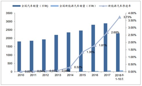 近年來,由于全球的能源緊缺和環(huán)境問題日益嚴(yán)重,各國都在加大新能源汽車的布局投入,新能源汽車取代燃油汽車幾乎已成為必然趨勢。2018年中國新能源汽車行業(yè)滲透率3.73%,潛在市場空間巨大。