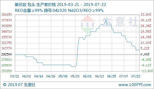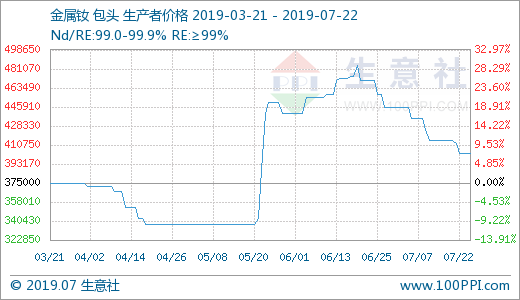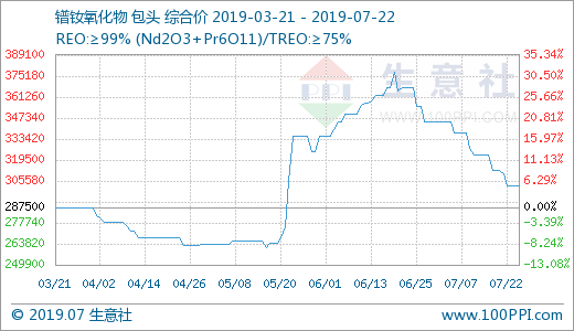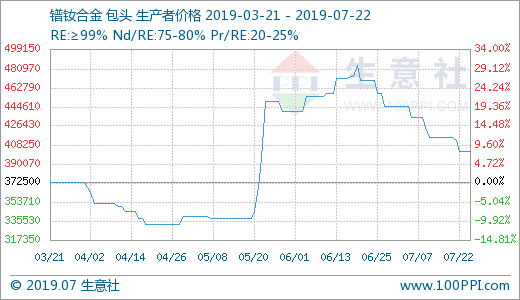 自6月下旬開始,國內(nèi)輕稀土市場價格大幅走低,氧化釹價格從380000元/噸走低至304500元/噸,整體跌幅高達(dá)19.87%;鐠釹氧化物價格從377500元/噸大幅走低至302500元/噸,跌幅高達(dá)19.8%;金屬釹價格從484000元/噸大幅走低16.84%至402500元/噸;鐠釹合金價格從484000元/噸下滑至402500元/噸,跌幅高達(dá)16.84%。近期國內(nèi)重稀土價格較為堅挺,但是輕稀土市場價格大幅走低,近期國內(nèi)磁材企業(yè)進(jìn)入需求淡季,短期之內(nèi)對于輕稀土需求不見好轉(zhuǎn),受部分廠家低價拋貨影響,輕稀土市場價格跌跌不休,但是中重稀土市場受供需方面影響,價格較為堅挺。