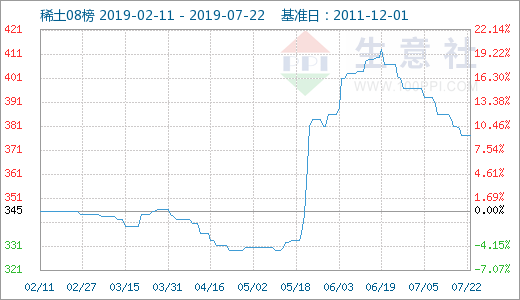 據(jù)監(jiān)測顯示7月22日稀土指數(shù)為377點,與昨日持平,較周期內(nèi)最高點1000點(2011-12-06)下降了62.30%,較2015年09月13日最低點271點上漲了39.11%。(注:周期指2011-12-01至今)。