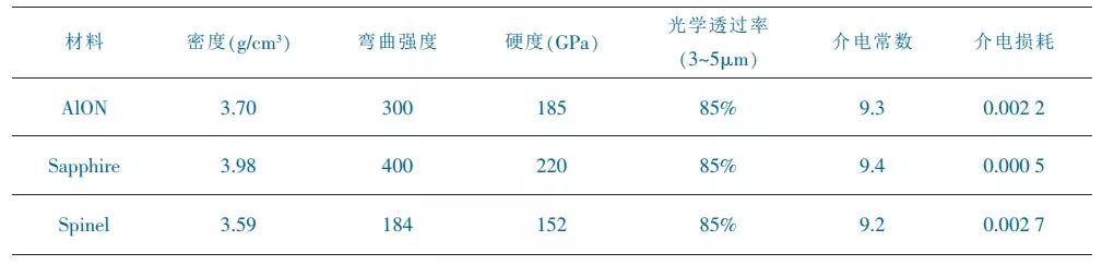 AlON、藍(lán)寶石(sapphire)和尖晶石(MgAl2O4)三種常用的中紅外材料的性能對比如表1所示,可以看出,AlON陶瓷的光學(xué)性能與藍(lán)寶石、尖晶石、氧化釔相當(dāng)(中紅外透光率>80%),而抗彎強(qiáng)度與藍(lán)寶石接近(300MPa),明顯高于尖晶石(190MPa)和氧化釔(160MPa)。由于藍(lán)寶石單晶窗口材料的制備成本非常高,且大尺寸很難制備,而AlON陶瓷則可以通過先進(jìn)陶瓷制備方法實現(xiàn)大尺寸及復(fù)雜樣品的制備,并具有光學(xué)各向同性的優(yōu)點,因此AlON陶瓷已成為高性能雙模天線罩和中紅外窗口的首選材料。