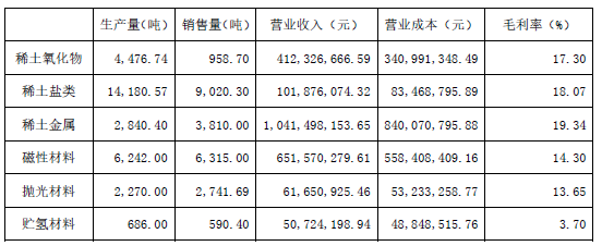 中國北方稀土高科技股份有限公司2019年第二季度(4-6月)主要有色金屬品種產(chǎn)銷量達(dá)2萬多噸,稀土氧化物銷量958.7噸,毛利率17.03%;稀土鹽類銷量9020.3噸,毛利率18.07%;稀土金屬銷量3810噸,毛利率19.3%。磁性材料6315噸,毛利率14.3%;拋光材料銷量2741.69噸,毛利率13.65%;貯氫材料銷量590.4噸,毛利率3.7%。
