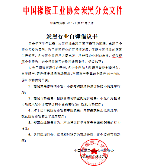 2019年8月1日,中國(guó)橡膠工業(yè)協(xié)會(huì)炭黑分會(huì)發(fā)布《炭黑行業(yè)自律倡議書》,《倡議書》稱,自去年下半年以來,炭黑行業(yè)出現(xiàn)了前所未有的困難,出現(xiàn)了全行業(yè)虧損的局面,為保證炭黑行業(yè)的正常生產(chǎn)經(jīng)營(yíng),倡議各企業(yè)自覺限產(chǎn),限產(chǎn)幅度應(yīng)根據(jù)市場(chǎng)需求在原有產(chǎn)量基礎(chǔ)上限產(chǎn)10%-20%,保證市場(chǎng)供需平衡;穩(wěn)定炭黑原料油市場(chǎng),不參與哄抬原料油價(jià)格的不良競(jìng)爭(zhēng)行為;穩(wěn)定市場(chǎng)銷售,按照合理利潤(rùn)空間銷售,不允許為搶占市場(chǎng)采取不計(jì)成本價(jià)的不良銷售行為擾亂市場(chǎng)秩序;對(duì)于出口到國(guó)際市場(chǎng)的中國(guó)炭黑,同樣要求禁止低價(jià)競(jìng)爭(zhēng)擾亂國(guó)際市場(chǎng)公平競(jìng)爭(zhēng)秩序;規(guī)范銷售行為,不允許無訂單發(fā)貨等非正規(guī)銷售行為發(fā)生;認(rèn)同區(qū)域劃分,保持相對(duì)穩(wěn)定的市場(chǎng)份額,避免造成市場(chǎng)動(dòng)蕩。