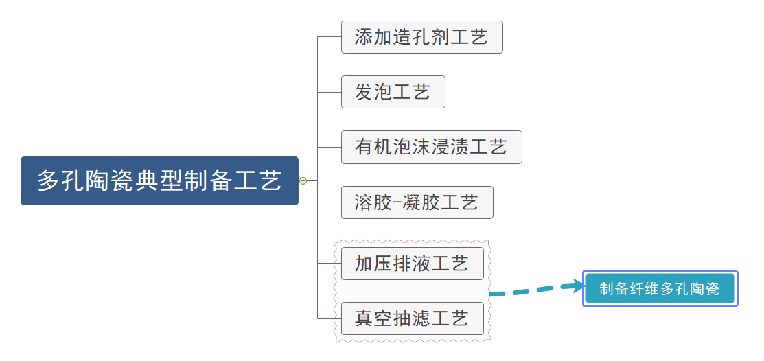 典型多孔陶瓷制備工藝:添加造孔劑工藝、發(fā)泡工藝、有機(jī)泡沫浸漬工藝,溶膠-凝膠工藝,還有制備纖維多孔陶瓷的加壓排液工藝和真空抽濾工藝。