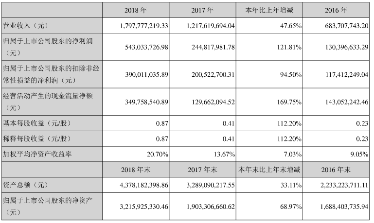 公司業(yè)績:公司2018年實(shí)現(xiàn)營業(yè)收入17.98億元,較上年同期增長47.65%,歸屬于上市公司股東的凈利潤5.43億元,比上年同期增長121.81%。每股收益0.87元。