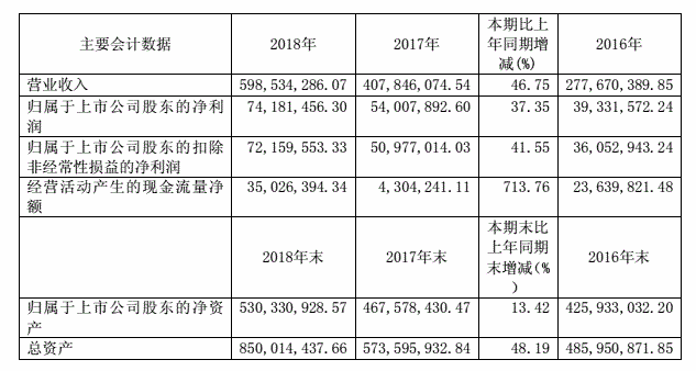 公司業(yè)績:2018年,公司實(shí)現(xiàn)營業(yè)收入為59,853.43萬元,同比上升46.75%;歸屬于上市公司股東的凈利潤為7,418.15萬元,同比增長37.35%。